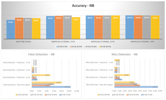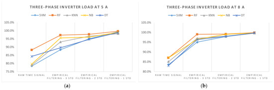 The diagnosis rates of three-phase inverter at 8 A using empirical filtering and Naïve Bayes (NB).