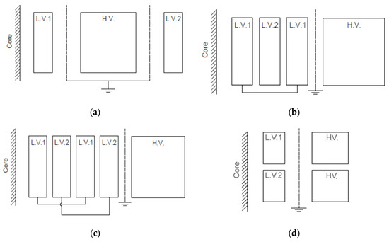 Various winding configurations: (a) concentric winding; (b) concentric winding with vertically interleaved LV winding (Type-A); (c) concentric winding with vertically interleaved LV winding (Type-B); (d) vertically stacked LV winding.