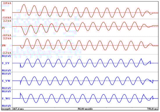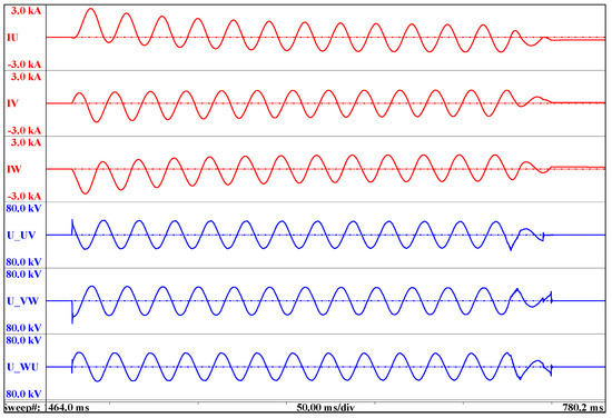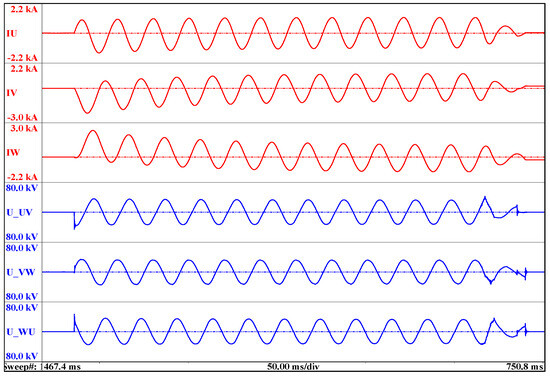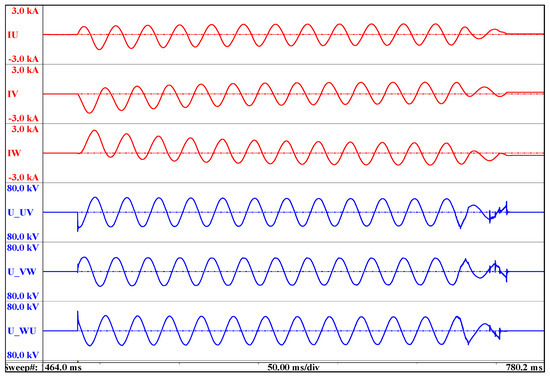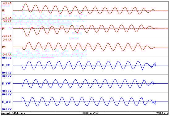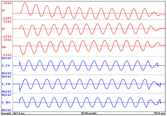 The values obtained in this experiment on plot 5 with short-circuit terminals 3U3V3W (Figure 11): voltage between phases, U1U1V = 24.6 kV; U1V1W = 24.7 kV; U1W1U = 25.2 kV; short-circuit current peak value on I1U = 2617 A; effective equivalent current I1U = 980 A; I1V = 924 A; I1W = 937 A; test duration t = 250 ms.