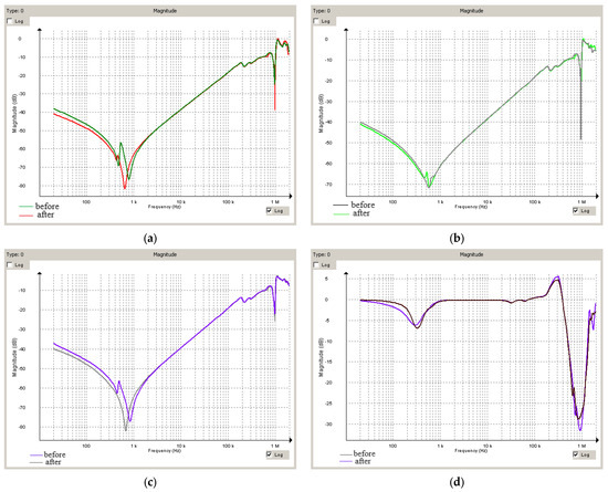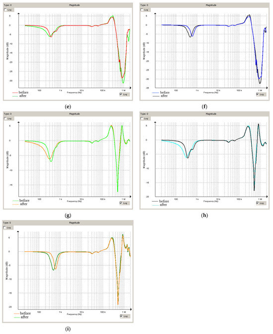 Frequency response analysis before and after on (a) 1u-1v; (b) 1v-1w; (c) 1w-1u; (d) 2u-2c; (e) 2v-2w; (f) 2w-2u; (g) 3u-3v; (h) 3v-3w; (i) 3w-3u.