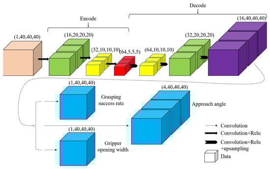 The purpose of the convolutional neural network (CNN) model of the grasping pose estimation in this paper is to establish a mapping relationship that can output the grasping success rate, approach angle, and gripper opening width at each voxel grid for an arbitrary input 3D voxel space by training the dataset and optimizing the parameters. The architecture of the CNN model is shown in Figure 1. Three-dimensional convolutional layers are employed as the basic structure in this architecture.