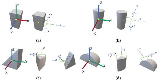 As shown in Figure 2, taking the cuboid as an example, the directions of its coordinate system represent the directions of three surface normals. The object posture is random in the scene. When the coordinate axis of the object points to a positive component, the z-axis direction of the grasping is the opposite of the object coordinate axis. Otherwise, the z-axis of the grasping and the object coordinate axis are in the same direction. Therefore, the z-axis, y-axis, and x-axis directions of the grasping are determined first. To improve the generalization of the dataset and consider the possible situations, a rotation of the gripper around its y-axis could be allowed, which is . The offset distances of the gripper along the z-axis, which are related to the geometric size of the object and depth of the gripper, could be allowed and are determined by the simulation experiments. In addition, an offset distance of the gripper along the x-axis is allowed, which is . Similarly, the setting rules of the grasping dataset for cuboid, cylinder, tri-prism, and hemicylinder are shown in Figure 2 and Appendix A.