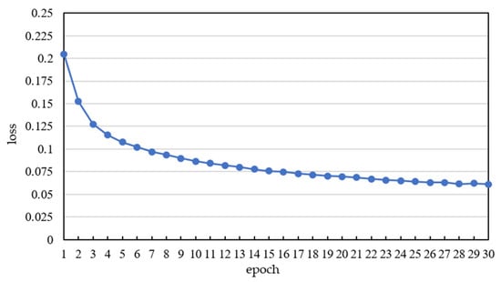 The data used for training and testing were randomly selected from the dataset in a 9:1 ratio. The Adam (Adaptive Moment Estimation) optimizer was employed to update the parameters in backpropagation during the training process. Meanwhile, the learning rate was set to 0.0003. In order to improve the training efficiency, the batch size was set to 48, and 30 epochs were performed on the training samples. The losses during the training process were calculated by Equation (5) and are shown in Figure 3. The loss in the initial epochs of training decreased rapidly and gradually converged to a smaller value. The effectiveness of the trained CNN model was verified.