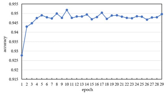 After each epoch, the testing dataset was input into the trained CNN model and compared with the outputs. The accuracy was calculated by Equation (6) and is shown in Figure 4. The accuracy of the testing dataset in the initial epochs of training increased rapidly and gradually stabilized around 0.95.