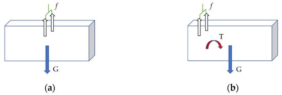 The grasping position has a significant impact on the grasping results. Taking a cuboid object as an example, the outputs of the CNN model show that the surfaces of the cuboid are probability positions that can be successfully grasped. However, when the line connecting the two grasping points of the fingers and the object is perpendicular to and intersects with the gravity direction of the object, the friction force between the gripper and the object can be equivalent to a force acting on the center of mass of the object. And the friction force only needs to balance the object’s own gravity in this situation. Otherwise, a torque causing object rotation will be generated inevitably, and the grasping success rate will be obviously reduced [], as shown in Figure 5. Therefore, the optimal grasping position should be located near the centroid of the object.
