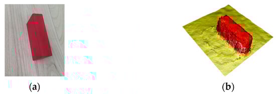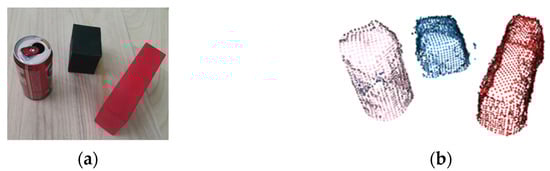 Therefore, the DBSCAN (density-based spatial clustering of applications with noise) method [] was employed to determine the centroid position of the object. By clustering the scene point cloud, each object was classified as a separate category, and then the centroid position of each category was determined. In addition, the RANSAC (random sampling consensus) method [] for the plane segmentation was employed to avoid the influence of the ground point cloud on the clustering.