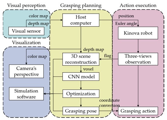 The experimental process of each grasping task is shown in Figure 9. The experimental system mainly consisted of four parts: visual perception, grasping planning, action execution, and visualization. The depth camera was used to obtain the color and depth maps in real time, with the depth map used for scene reconstruction and the color map used to visualize the camera’s perspective. For each grasping task, the first step was to perform a 3D scene reconstruction using multi-views fusion. The robot with the camera was controlled to reach the designated position in sequence, and after completing the observation tasks of three views, the voxel grids containing 3D scene information were generated. Then, the voxel grids were input into the trained CNN model. And, after optimizing the output results of the CNN model, the final grasping pose was obtained. Finally, coordinate conversion was performed, and the robot completed the subsequent grasping action.