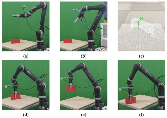 The whole process of the single-object grasping experiment. (a) Initial position; (b) 3D scene reconstruction; (c) grasping planning; (d) grasping action; (e) moving procedure; (f) placement.