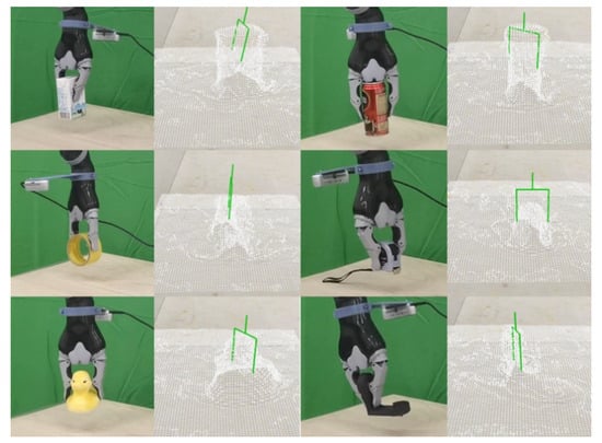 Firstly, grasping experiments were performed on the two regular objects, cuboid and cylinder. According to the above process, grasping attempts were performed 100 times for each type of object. In these experiments, the poses of the object were randomly chosen. The side length of the cuboid exceeded the limit of the gripper opening width in the situations of the flat placements. Therefore, these cases were removed, and the number of times the grasping task was completed for each viable attempt was recorded, as shown in Table 1.