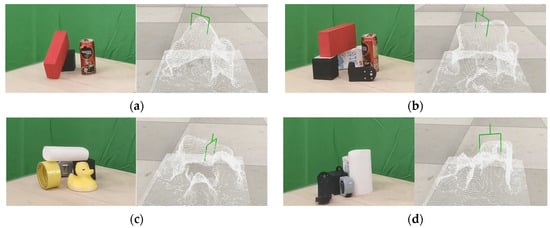 The overall grasping success rate of the algorithm was 81.1%, which was lower than that of the single-object environment. In particular, the grasping success rate was 71.4% in Scene IV. This is due to the mutual occlusion and stacking of multiple objects, which interfered with the planning process of the algorithm. The stacking situation has an influence on the determination of the centroid of the object, as it is difficult to segment the point cloud of each object individually. The position of the centroid of the determined object may appear between the two objects, resulting in a grasping failure. In addition, grasping failures because of the robot’s workspace limitation also occurred.