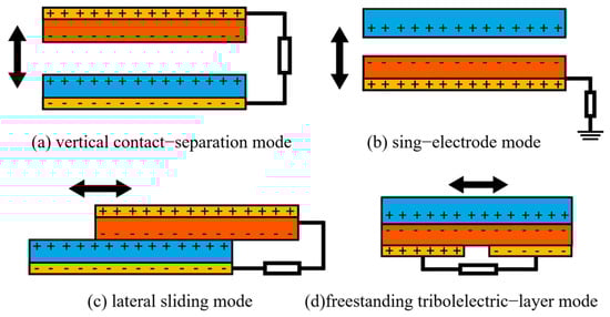 TENG has the characteristics of inherent capacitors, and two capacitors are formed between its surface friction-charged electrical surface and two metal electrodes. The ratio of these capacitors varies according to the position of the electrical medium’s surface, leading to electron transfer between the metal electrodes when short-circuited. This mechanism underlies the operation of TENG [45]. Based on the motion of the electrification layer and the configuration of the electrodes, TENG can be classified into four fundamental modes. Figure 1 illustrates the four basic working modes: vertical contact-separation mode, single-electrode mode, lateral sliding mode, and freestanding triboelectric-layer mode [46,47,48,49].