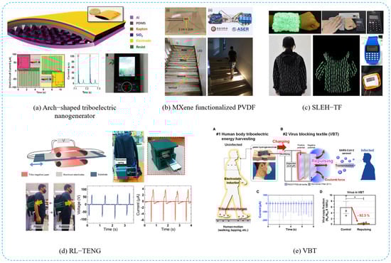 In 2022, Minki Kang and the research team from Sungkyunkwan University and Seoul National University developed a virus−blocking textile (VBT) design (as shown in Figure 4e) [61]. This innovative textile utilizes nanotechnology and harnesses human friction-generated electricity to apply a coulomb force to airborne particles, effectively blocking SARS-CoV-2. The VBT devices generate electrical current through human motion and continuously supply the textile with a negative potential, enabling it to repel virus with a negative charge. Experimental results demonstrate that the VBT can effectively block 99.95% of airborne SARS-CoV-2 particles.