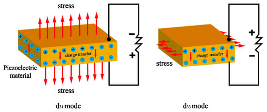 Figure 7 illustrates the positive piezoelectric effect, which is a polarization phenomenon resulting from deformation. Conversely, when an electric field is applied to piezoelectric materials, the material undergoes polarization and experiences a deformation process known as the inverse piezoelectric effect [99]. There are two standard modes of the piezoelectric effect: d31 (Longitudinal) and d33 (Transverse) (as depicted in Figure 8) [100,101]. When an external force acts on the piezoelectric materials, equal and opposite charges are generated on the top and bottom surfaces. In the d33 model, the direction of mobile charge is parallel to the direction of the external force. On the other hand, in the d31 model, the charge moves perpendicular to the direction of the external force.