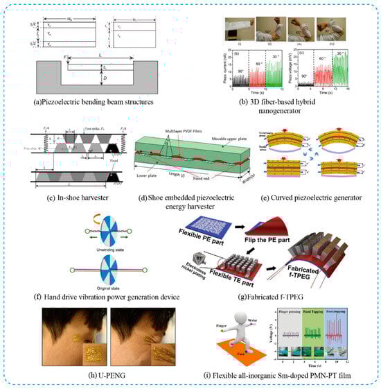 The human body plays a crucial role as an abundant source of energy, with its daily activities involving significant energy consumption and generation. Various bodily functions such as walking produce kinetic energy, exercise and sweating result in biomass energy, and the blood flow within the body, the beating of the heart, and the peristalsis of the digestive organs contribute to energy generation [25,26]. The majority of this energy is utilized for sustaining daily bodily activities. Consequently, there is a growing need for the development of simple and efficient energy harvesting devices capable of converting mechanical motions from different body parts into electrical energy [27,28,29]. From the perspective of human motion, the development of human energy harvesting devices mainly utilizes the following biomechanical energy: center of mass (COM) motion, joints motion, foot strike, and limb swing motion [30]. These devices can then power a wide range of wearable electronic devices, thereby extending their continuous working time [31,32,33]. Based on different energy harvesting principles, three primary types of devices are commonly employed: piezoelectric, friction-based, and electromagnetic devices [34,35,36]. Piezoelectric energy harvesting relies on the deformation of piezoelectric materials, which generates opposite charges on the corresponding surfaces through the coupling effect between the material’s dielectric properties and elasticity. This process effectively converts mechanical motion into electrical energy output. Friction-based devices generate energy by creating friction between the human body-driven devices and other objects, thereby converting dispersive energy into electrical energy. The electromagnetic approach involves transforming human body motion into mechanical motion, causing a permanent magnet within the device to cut through magnetic sensing lines and generate electrical energy. Due to their simple structures, lightweight design, relatively high harvesting efficiency, and alignment with the requirements of sustainable development, these three types of energy harvesting devices are considered the primary methods for collecting human motion energy.