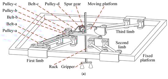 A hybrid manipulator employed for the picking-and-placing operation is proposed, as shown in Figure 1a. This hybrid structure comprises a planar parallel mechanism [] (shown in Figure 1b), a belt drive system, a rack and pinion module, and a gripper. The coordinate system is located at the bottom left corner, as illustrated in Figure 1b. Based on the right-hand rule, the Z-axis is perpendicular to the XOY plane and points outward.