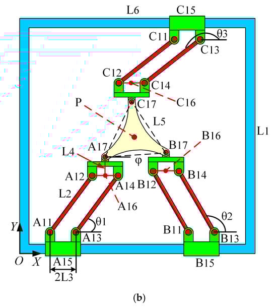 The detailed linkage dimensions of the parallel manipulator with three identical chains are also illustrated in Figure 1b. The fixed platform is a rectangle with a length of L1 and width of L6. .. . The corresponding linkages of the three chains have the same dimensions. Mobile platform A17B17C17 forms a virtual equilateral triangle with an edge of L5, and its center is point P. According to the features of this triangle, . The positions along the X direction of active sliding joints A15, B15, and C15 are x1, x2, and x3, respectively. The system input of this parallel manipulator is defined as . The sloping angles between the positive X-axis and linkages A13A14, B13B14, and C13C14 are, respectively, denoted as , , and . The angle between the virtual edge A17B17 and the positive X-axis is . The position of point P in the provided coordinate system is (x, y). Thereafter, the pose of the mobile platform is given as .