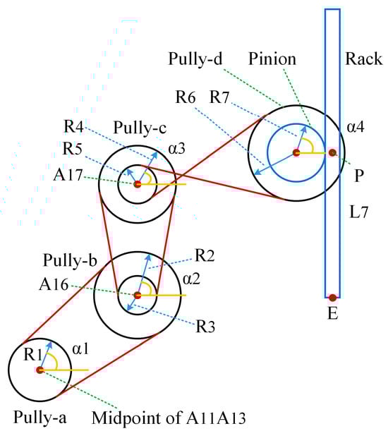 The initial configuration of the vertical (along the Z direction) translation system is illustrated in Figure 2. Figure 2 is depicted in a two-dimensional plane to clearly state all parameters. The dimensions of this system are described, and the radius of pulley-a is R1. The radii of the two pulleys within pulley-b are R2 and R3. The radii of the two pulleys of pulley-c are R4 and R5. The radius of pulley-d is R6. The pitch diameter of the pinion is defined as 2R7. The rack has a length of L7. In this original assembly configuration, the midpoint of the rack is placed at point P of the moving platform. The bottom point of the rack that is attached to the end-effector is represented as E. It is noteworthy that the x- and y-components of the position of point E are the same as that of point P. The only unknown parameter is the z-component of the displacement of point E.