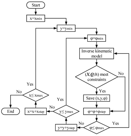 To solve the reachable workspace, the position range of mobile platform A17B17C17 is predefined as and . The spatial search methodology is employed to obtain the reachable workspace. The flow diagram of this approach is demonstrated in Figure 3. According to the above conditions, the parameters in this flowchart are listed as xmin = 2L3, xmax = L6 −2L3, xstep = 4 mm, ymin = 2L3, ymax = L1 − L5, ystep = 1 mm, , , and . In the provided X range, each possible position is employed to compute the corresponding Q based on the inverse kinematic model introduced in Section 3.1. This position will be feasible once it meets all aforementioned constraints.