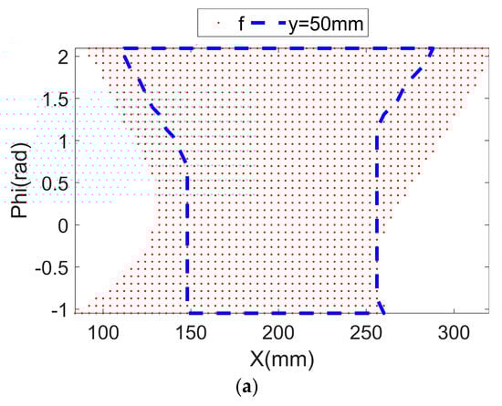 The reachable workspace is one of the most essential indices for a parallel manipulator. For introductive purposes, the linkage dimensions of this parallel manipulator are selected as L1 = 150 mm, L2 = 120 mm, L3 = 20 mm, L4 = 0, L5 = 50 mm, and L6 = 400 mm. The first factor that affects the workspace’s volume is the strokes of the driving joints. In this mechanism, the strokes of three actuation joints are provided as . In accordance with the current manipulator configuration in Figure 1b, the symbols in Equations (5), (12) and (13) are chosen as , , and , respectively. According to the geometric relations, passive angle is computed as