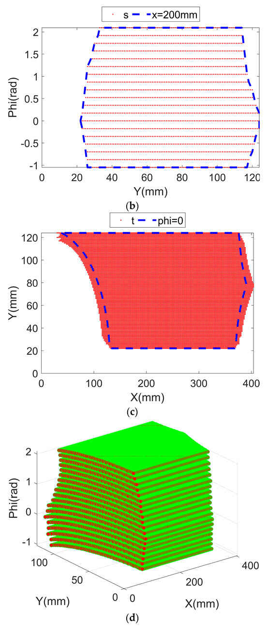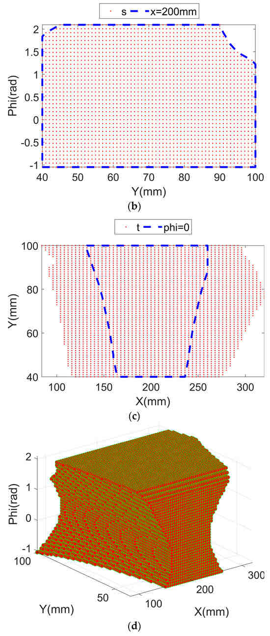 The reachable workspace of this planar parallel mechanism is computed and shown in Figure 4. Figure 4a–c are the standard views while Figure 4d presents the 3D view. The irregular shape of this workspace can be revealed by the standard views, selected layers, and 3D view. In accordance with Figure 4, when , the workspace is the smallest, and the workspace increases when orientation is larger or smaller. The reachable workspace is irregular and asymmetric, which causes difficulty during applications.