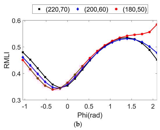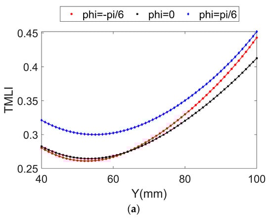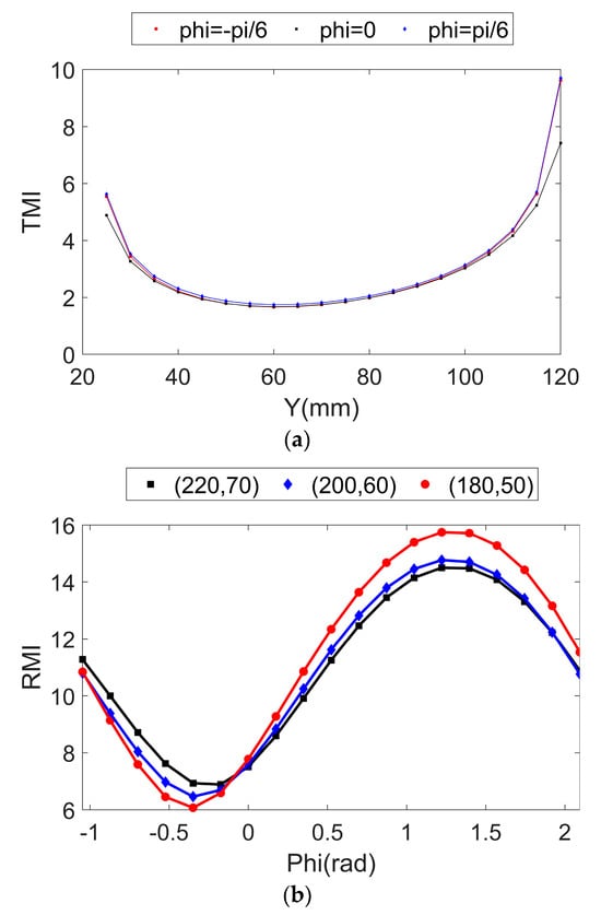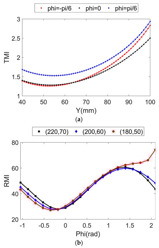 The linkages’ dimensions are already provided in Section 4.1. Both TMI and RMI can be computed and are not associated with position x according to the numerical calculations provided by the software. TMI-y and RMI- are plotted in Figure 5. From Figure 5a, TMI decreases at the beginning and then improves as the moving platform moves along the positive Y-axis. The TMI layouts of are similar. The TMI ranges from 1.24 to 15.4756 in the entire workspace, and the average value is 2.755. Three sets of (x, y) values (unit: mm) are selected to obtain Figure 5b, (180, 50), (200, 60), and (220, 70). From Figure 5b, the RMI distributions of all these scenarios seem cyclic before the first 2/3 period, while the first case indicates an upward trend, and the other two cases maintain this tendency in the following 1/3 period. In the overall workspace, the smallest and largest RMIs are 26.4522 and 244.619, respectively. The mean RMI is 52.7392.
