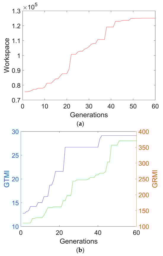 Performances in the optimization process: (a) workspace volume; (b) GTMI and GRMI.