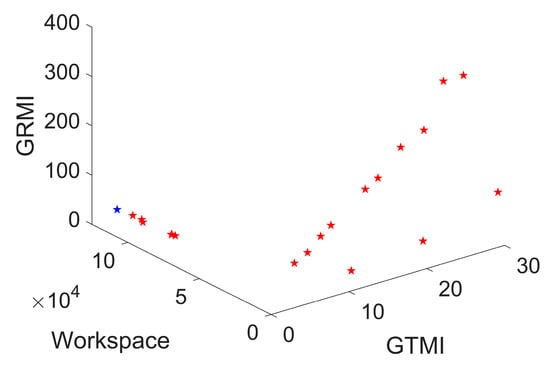 The performances of all individuals in the final generation (Pareto front) are represented in Figure 8. Considering that the workspace is important in picking-and-placing operations, the individual (shown as a blue pentagram in Figure 8) is selected relative to the largest workspace volume. The other individuals are not chosen because the workspace shrinks sharply, although GTMI and GRMI exhibit improvements. The linkage lengths are provided as L1 = 1493.9428 mm, L2 = 114.2580 mm, L3 = 10.0368 mm, L4 = 8.0307 mm, L5 = 12.9197 mm, and L6 = 499.5674 mm. This set of linkages are further rounded as L1 = 150 mm, L2 = 114 mm, L3 = 10 mm, L4 = 8 mm, L5 = 13 mm, and L6 = 500 mm. These three optimization objectives are generated and compared with those of the initial linkages’ lengths (Section 4.1). The corresponding results are shown in Table 1. The corresponding performance ratio is calculated as the ratio between those of the initial linkages and the chosen linkages. From Table 1, the optimized set of linkage has a significantly larger workspace and greater GTMI, with the sacrifice of GRMI.