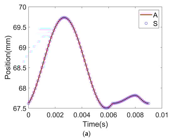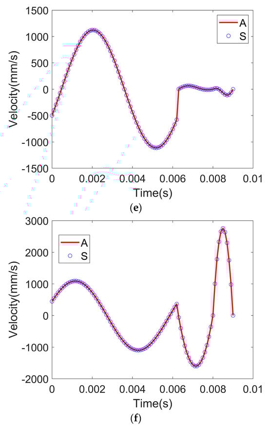Comparison between the analytic and simulation results (A—analytics; S—simulation): (a) position of the first slider; (b) position of the second slider; (c) position of the third slider; (d) velocity of the first slider; (e) velocity of the second slider; (f) velocity of the third slider.
