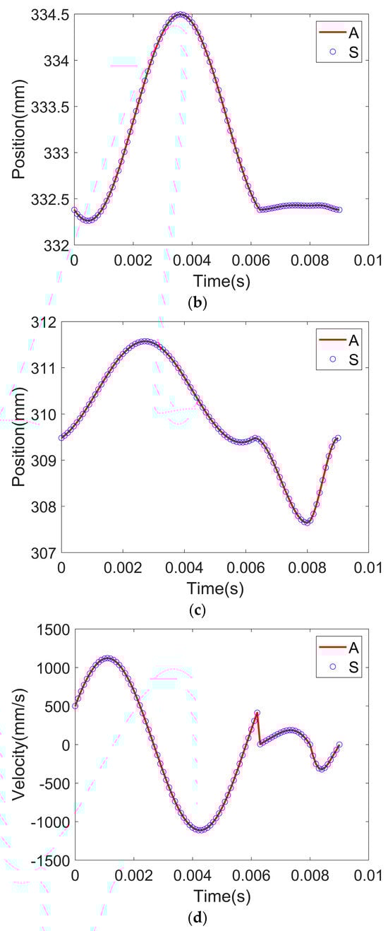 The positions of three prismatic sliders are measured after the simulation process in MSC ADAMS. The mathematical inverse kinematic model in Section 3.1 is employed to calculate the corresponding analytical positions of these active joints. Figure 11a–c illustrate two sets of results, and the corresponding trajectories of these sliding joints are the same. The positions of the three joints return to their corresponding starting positions during the entire period. The position of the first joint presents an increasing trend from 0 to 0.0027 s and from 0.0058 s to 0.008 s. It decreases from 0.0027 s to 0.0058 s and from 0.008 s to 0.009 s. The position of the second joint decreases from 0 to 0.0005 s and then increases significantly until 0.0036 s. It then exhibits a downward trend until 0.0063 s. The positions are at around 332.4 mm for the rest of this trajectory. The position of the last joint continually increases, with the exception of two other periods: from 0.0027 s to 0.0059 s and from 0.0063 s to 0.008 s.