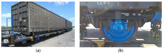 This sub-section includes the aspects considered in the numerical modeling of the vehicle. The freight railway vehicle used in this work consists of a Laagrss-type wagon (Figure 1a,b), which is a freight vehicle with a 45 feet flat steel platform designed for the transportation of containers, that operates between Portugal and Spain and can reach speeds of up to 120 km/h. The platform is supported by two single wheelsets with leaf-type suspension, whose dynamic parameters were obtained in the experimental calibration of the numerical model developed by Braganca et al. [44].