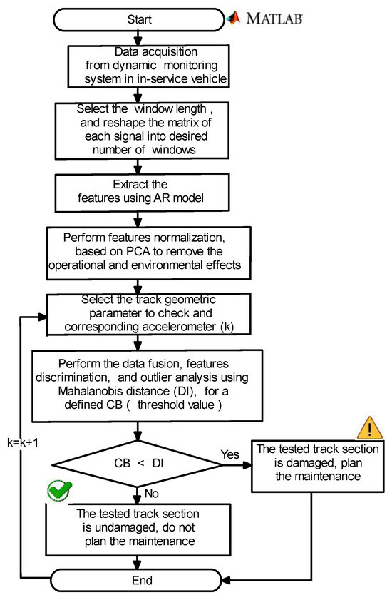 An automated AI-based methodology for the detection of damage to railway track was adapted based on the one firstly developed by Meixedo et al. [25] for damage identification in railway bridges. But it was not yet applied for the detection of damage to tracks using an onboard monitoring system for in-service vehicles, under big data conditions. The methodology deployed herein, using MATLAB® software, consists mainly of the following self-explanatory steps depicted in Figure 4. The main steps in the methodology are: (i) feature extraction using the AR model, for extraction of the most sensitive statistical variables, (ii) data normalization based on PCA to remove the environmental and operational effects, and (iii) a detection step that comprises data fusion, features discrimination, and outlier analysis.