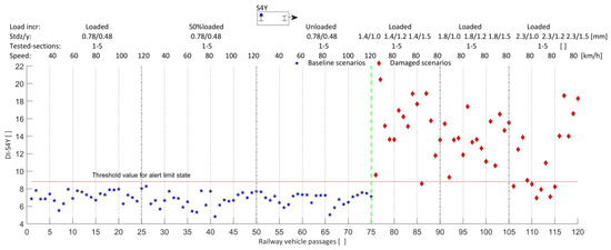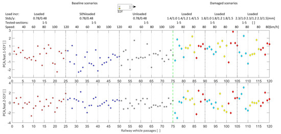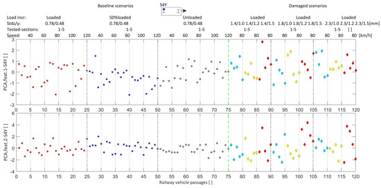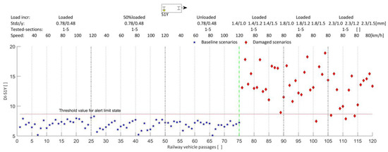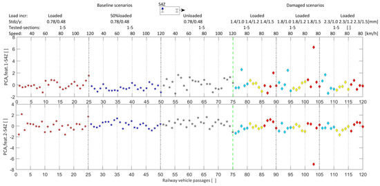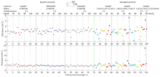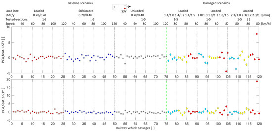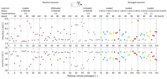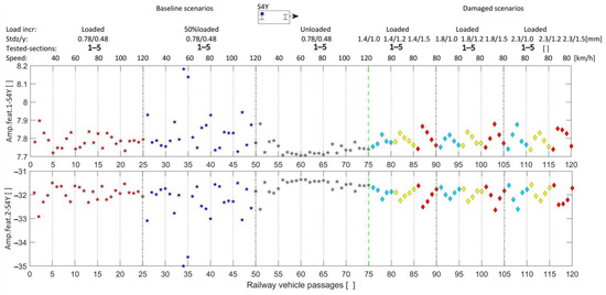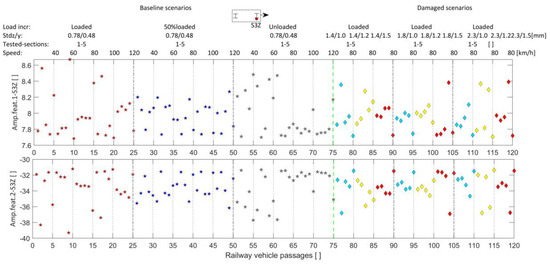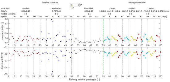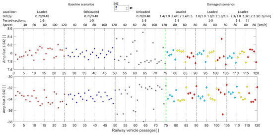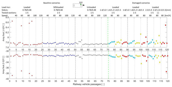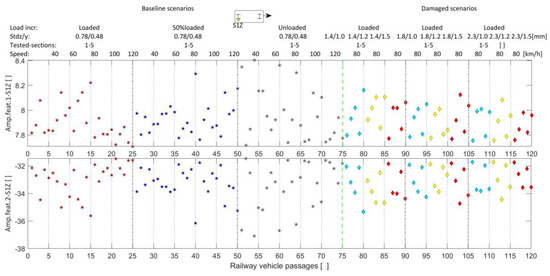 Figure 6, Figure 7, Figure 8, Figure 9, Figure 10, Figure 11, Figure 12 and Figure 13 illustrate the results for some of the features extracted from the lateral rear and front axle box accelerometers, for randomly selected features 1 and 2, from a matrix s with a dimension r × f (i.e.,   120 × 50 ), whose row entries are the total number of railway vehicle passages ( r ) , which is equal to the number of scenarios, and the column entries are the total number of features ( f ) for the assessment of the railway track maintenance condition, under the alert limit state (ALS), for all k = 8 sensors. Note that the recognition patterns, corresponding to the baseline scenarios, are more dispersed around the mean, which highlights the dynamic effects on the vehicle due to speed and wagon load variations, since the track condition is the same. The opposite happens for the damage scenarios, with the same speed and different severity of damage. This result also shows that it is not practical to differentiate the baseline from the damage scenarios using only this step, which comprises the extraction and visualization of the features. Furthermore, as the amplitude of the features is more dispersed around the mean, due to the inclusion of the effect of speed and vehicle loading, these need to be removed to increase the damage detection accuracy. For this reason, data normalization is performed. The Stdz/y denotes the standard deviation for the longitudinal level and lateral alignment, for the previously mentioned scenarios and “1–5” denotes the range of tested track sections, each with 1080 m. These figures show that when the standard deviation increases, it does not necessarily mean that the corresponding feature amplitude will increase. Due to the presence of operational and simulated environmental effects, it means that the baseline and damage scenarios cannot be separated using the amplitude of the features. In Figure 6, Amp.feat.1-S4Y, denotes the features amplitude 1, extracted from the sensor S4Y (Figure 2), and Load incr. denotes the load increment or the condition for loading of the wagon. These details are analogous to Figure 7, Figure 8, Figure 9, Figure 10, Figure 11 and Figure 12.