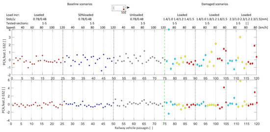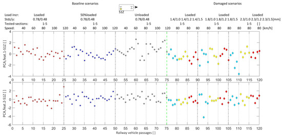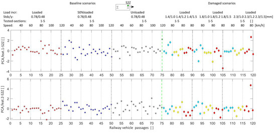 Feature normalization is crucial for achieving the most accurate damage identification. Otherwise, the influence of environmental and operational effects on the acceleration signals can generate false positives. Principal component analysis (PCA) is a latent variable method that has been efficiently applied for this purpose. Considering an n × m matrix X , where m denotes the number of AR parameters extracted from the railway vehicle axle box acceleration signals, and n is the number of simulations for the baseline scenarios. The eigenvalues of the covariance matrix of X, which transform X into another set of m parameters, Y, are designated principal components, whose computation is obtained using Equation (3), where T is an m × m orthonormal linear transformation matrix that applies a rotation to the original coordinate system. The covariance matrix of the baseline feature, C, is related to the covariance matrix of the scores, Λ, using Equation (5). The superscript T denotes the transpose of the matrix T , where T and Λ denote the matrices obtained by the singular value decomposition (SVD) of the covariance matrix C of the features. The columns of T are the eigenvectors and the diagonal matrix Λ comprises the eigenvalues of the matrix C in descending order. Hence, the eigenvalues, that is, the coefficients of the linear combination of the principal components stored in Λ are the variances of the components of Y . They express the relative importance of the variation or damage for each principal component in the entire data set [25]. In a vehicle–track dynamic system, the vehicle acceleration signals are also influenced by the vehicle speed and the loading condition. Therefore, to separate the effects caused by the operational and environmental variability from the changes caused by the damage itself, all the features (firstly merged into a struct array) were normalized based on PCA and computed PCA residuals. The PCA can retain meaningful information related to the operational and environmental effects in the first components, thus the remaining components are those that enable the state of the damage to be distinguished from the state of an undamaged railway track. There are different ways to select the most informative principal components, which explain the largest variance in a dataset. Generally, values not less than 80 are chosen [70]. Another method is based on plotting the eigenvalues as a function of the number of principal components and then selecting those components, from which the eigenvalues are reasonably small, similar to the AIC plot (Figure 5). After neglecting the most influential principal components ( p ) that explain the largest variance, the m p principal components of the matrix Y are calculated using Equation (3) and a transformation matrix T ^ is built with the remaining m p columns of T . Those m p components can be remapped to the original space using Equation (5). This computation process was repeated for all matrix s , whose entries are the features from each of the eight onboard axle box accelerometers.
