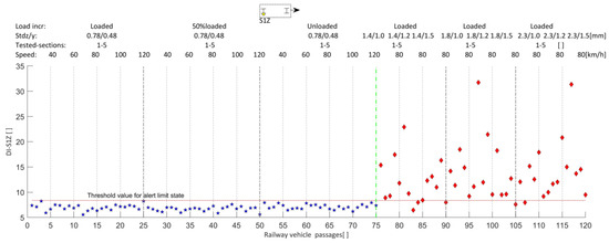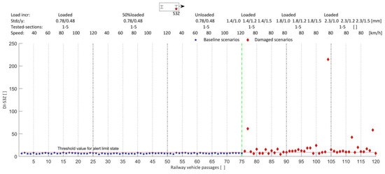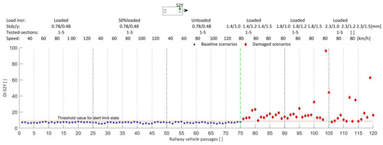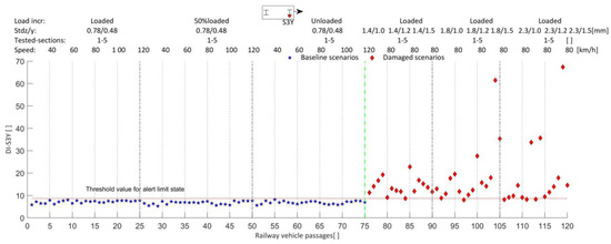 Data fusion is the process of integrating data from multi-accelerometers to produce more consistent, accurate, and useful information than any individual feature or accelerometer. It improves the computational efficiency, data visualization, and interpretation, and increases the sensitivity of the features to the damage scenarios. As a result, a damage indicator ( D I ) is determined for each simulation and each tested track section. The Mahalanobis distance is a metric distance or similarity measure, used in machine learning to distinguish structural conditions. It is also understood as a fusion of multivariate data into a single D I , as referred to in Silva et al. [24], and Meixedo et al. [25]. The D I calculates the distance (i.e., dissimilarity or difference) between the damage and the baseline scenarios to state how severe each tested track section is compared to the normal condition. Since the features that characterize the vehicle vibration under damage and non-damage scenarios are stored in vectors, and the distance between two vectors always results in one value, this is what also leads to this process being called data fusion. This value is then used, together with a threshold (defined within a confidence boundary), to conclude whether a certain tested section of the railway track requires intervention, related to the alert limit state. Since D I and the threshold are automatically calculated, this process is called unsupervised machine learning. Equation (6) expresses the difference between several features, so that the baseline features are very similar (have close DI values between them) and very different from the damage-sensitive features, with a DI value mostly greater than the threshold. In Equation (6), D I i denotes the Mahalanobis damage indicator for each simulated railway vehicle passage ith, x i denotes a vector of m features representing the possible damage, x ¯ is the matrix of the mean values of the features estimated from the baseline scenarios, and S x is the covariance matrix of the baseline simulations. The D I i is computed for each simulation and each sensor resulting in a n × k matrix, whose entries are the D I i for the k accelerometer (s), and n is the total number of scenarios (baseline and damage scenarios). The subscript T denotes the transpose and S x 1 is the inverse of the covariance matrix. Then, a new D I i is determined, considering features from more than one sensor to obtain a vector n × 1 , i.e., a multi-sensor fusion from all the k = 8 , accelerometers.