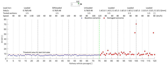 It can be observed that all the STD values for the BSC are less than for the damage scenarios, as stated before. For the baseline scenarios, the freight wagon is subjected to three load increments in the wagon or loading scheme: (a) fully loaded (i.e., 100% loaded), (b) half load (i.e., 50% loaded), and (c) empty or tare (i.e., unloaded).