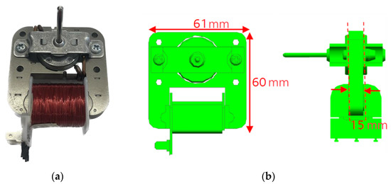 Existing cooling fan motor (SPIM): (a) cooling fan motor (SPIM); and (b) cooling fan motor (SPIM) size.