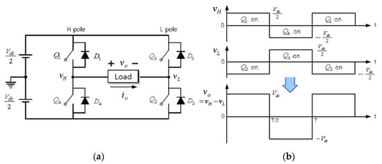 Due to its inefficient utilization of DC voltage, the single-phase half-bridge inverter is not a suitable option for generating effective single-phase AC voltage. Therefore, the full-bridge inverter is used. Figure 2 represents the circuit and output voltage of the single-phase full-bridge inverter. In order to obtain an effective single-phase AC voltage, each voltage must be switched with a phase difference of 180 degrees. Therefore, switches D1, D2, and switches D3, D4 alternate between on and off states. The fundamental and harmonic components during that period are represented by Equation (6). The single-phase full-bridge inverter is predominantly used because it can obtain twice the AC voltage compared to the half-bridge inverter, all under the same DC voltage. The output voltage of the single-phase full-bridge inverter is provided in Equation (7), where the H Pole and L Pole represent the sections of switches as shown in Figure 2, with the H Pole corresponding to switches and , and the L Pole corresponding to switches and . denotes the pole voltage for H Pole, represents the pole voltage for L Pole, is the switching function for H Pole, and is the switching function for L Pole [16].