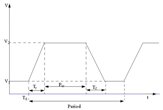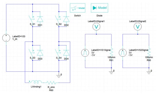 Figure 3 represents the circuit of the integrated single-phase full-bridge inverter. To integrate the single-phase full-bridge inverter, four elements are required: the inverter input voltage (), diode specifications, switch resistance (), and two signals for the switches On and Off. The input voltage and diode specifications can be obtained from the inverter’s specifications. Switch resistance can also be determined through the inverter’s specifications, and it may vary depending on the circuitry of each Drive IC. Typically, the resistance or the switch is represented as the sum of the resistances for the two switches ( and in Figure 3). When designing the motor, it is essential to match the inverter’s current limit. The current value is influenced by the voltage drop component resulting from the switches. Thus, it is necessary to take into account the switch resistance. Finally, two signals are required for controlling the switching of the switches on and off. Figure 4 represents the waveform of the node voltage. Signal1 is connected to switches and , while Signal2 is connected to switches and . When the node voltage of the signals is greater than 0 V, the switches are ON, and when it is less than 0 V, the switches are OFF. To prevent the inverter from shoot-through, the ON and OFF times of each switch need to be delayed, and therefore, and in Figure 4 must be greater than 0.