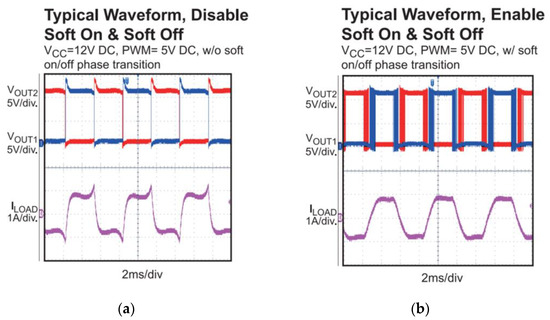Current waveform with soft ON and soft OFF control: (a) Current waveform without using soft ON and soft OFF function; and (b) Expected current waveform when using the soft ON and soft OFF function.