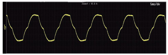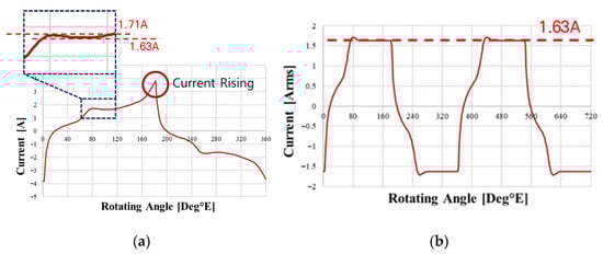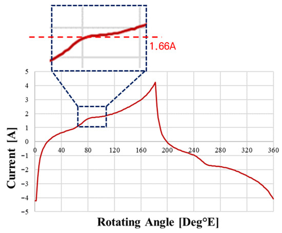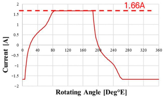 A prototype motor of the proposed external rotor single-phase BLDC motor was produced and tested to validate the feasibility of the Drive IC integration analysis. Soft ON and soft OFF functionality was utilized during the testing. To account for dead time, and were set to 10 μdeg. Figure 25 represents the prototype motor’s configuration. Figure 26 represents the expected current waveform considering the soft ON and soft OFF function, while Figure 27 represents the current waveform obtained during the testing of the prototype motor. In Figure 27, the x-axis represents time, and the y-axis represents current. Table 10 presents the output and torque values obtained through FEA and those obtained through testing. This demonstrates the validity of the full-bridge inverter (Drive IC) integration analysis proposed in this paper.