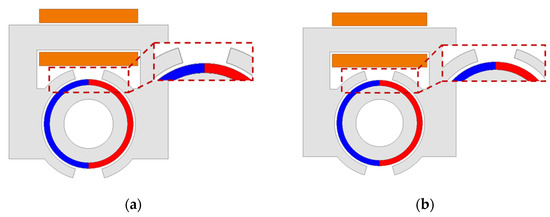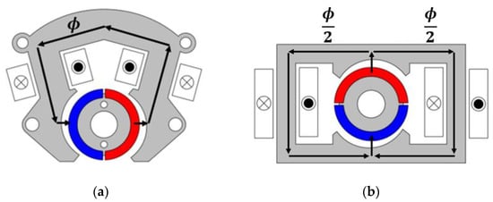 A single-phase brushless DC motor operates through the use of a mechanically generated alternating magnetic field, which occurs via the winding of coils on the stator. This differs from a three-phase brushless DC motor, which utilizes a rotor in its operation. Therefore, the stator typically has an equal number of poles and slots in a 1:1 ratio. When a single-phase brushless DC motor is in operation, the interaction between the rotor magnets and the stator teeth produces cogging torque. Additionally, the interaction between the stator current and the rotor magnets results in magnetic torque. A single-phase brushless DC motor with an equivalent number of poles and slots may produce magnetic torque that matches cogging torque. Additionally, at the point where the cogging torque becomes zero, the magnetic torque can exhibit negative torque. This creates a zero-torque region referred to as the “dead point”. Due to the dead point, a single-phase BLDC motor becomes unable to start its operation [14]. Therefore, for single-phase motors utilizing the alternating field mechanism, it is essential to verify the availability of starting torque. To eliminate the dead point, it is common to apply an asymmetric air-gap shape. When an asymmetric air-gap shape is applied, a phase difference occurs in the cogging torque, preventing the occurrence of zero-torque regions. Research has been conducted to propose various shapes for asymmetric air-gap and analyze their performance characteristics [18,19,20].