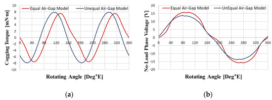 Comparison of cogging torque and no-load phase voltage waveforms between symmetric air-gap model and asymmetric air-gap model: (a) cogging torque waveform; and (b) no-load phase voltage waveform.