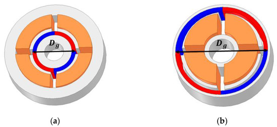 The internal rotor and external rotor types feature a cylindrical design, resulting in reduced stator core material usage. According to Equation (9), the external rotor design outperforms the internal rotor design in terms of performance. In Equation (9), represents the specific electric charge divided by the total electric charge from the void to the circumference, represents the winding factor, and is a fundamental component of the magnetic flux density in air gap [22]. The design of a model that meets target performance parameters necessitated the selection of the external rotor type from among both internal and external rotor types. Figure 10 illustrates the variations in air-gap diameters observed between the two types.