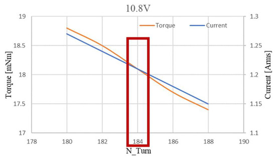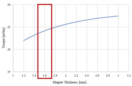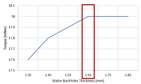 The magnet material was replaced with HMG-4, and based on considerations of the stator core saturation characteristics and torque characteristics, a stator back yoke thickness of 1.65 mm was chosen. Figure 17 represents the torque characteristics with respect to the stator back yoke thickness. To meet the target performance, it was crucial to secure the required number of turns. Therefore, the number of turns that satisfies the target performance was selected, considering the slot fill factor (50%) and current density ( or below). Additionally, the motor outer diameter was determined accordingly.