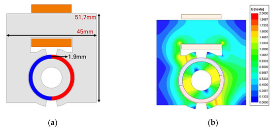 The initial design model of the C-Type single-phase BLDC motor: (a) configuration of initial design model; and (b) the initial design model’s magnetic flux density at saturation.