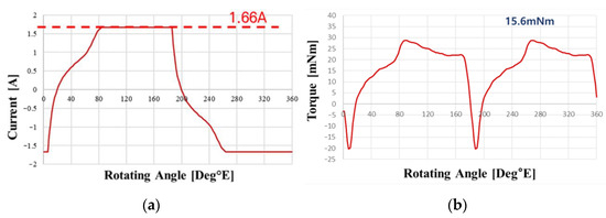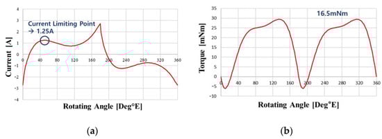 Incorporating the soft ON and OFF function results in reduced current, as seen in the current waveform in Figure 6. Therefore, further FEA analysis is necessary via additional current waveforms. During the assessment of the Drive IC integration, the input current was estimated by analyzing the current waveform when implementing the soft ON and OFF features. It was confirmed through finite element analysis (FEA) that the desired performance is achieved when the input current is implemented as 1.66 A. Figure 23 represents the current waveform and torque waveform when applying the soft ON and OFF function, and Table 8 presents the performance of the final model of the external rotor single-phase BLDC motor. Figure 24 represents the operating point of the motor. The design points have been chosen based on the highest speed and torque values within this operational region.