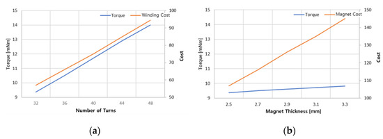 Figure 15 illustrates the relationship between torque and cost, as related to the increase in the number of turns and magnet usage. When the cost of increasing the number of turns and the magnet thickness is equal, it is more beneficial to increase the number of turns rather than the magnet thickness for an increase in torque. The higher residual magnetic flux density of the HMG-12L Nd-bonded magnet saturates the core, which poses a challenge in achieving the necessary number of turns to attain the desired performance target. Therefore, a comparison of the saturation densities between Nd-Bonded Magnet HMG-4 and HMG-12L was conducted for the purpose of considering a change in magnet material. Table 6 indicates the residual magnetic flux densities of the examined magnets, and Figure 16 indicates the magnet saturation densities attained by applying Nd-Bonded Magnet HMG-4 and HMG-12L Designing with HMG-4 is preferable for securing the required number of turns, considering the magnet saturation density, compared to HMG-12L. Therefore, HMG-4 is utilized in the design.