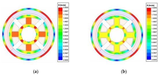 Magnetic flux path comparison: (a) Magnetic flux path of C-Type BLDC motor; and (b) magnetic flux path of R-Type BLDC motor.