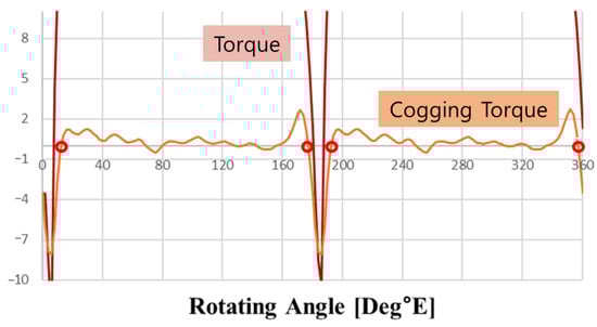 The target performance was achieved by selecting a total of 216 turns, taking into account the current limitation of the Drive IC, current density, and slot fill factor. To ensure the attainability of a viable phase angle for startup, an asymmetric air-gap was employed. The application of an asymmetric air-gap results in a shift in the phase of the cogging torque, allowing the magnetic torque to exceed zero at the point where the cogging torque reaches zero, enabling the motor to start. Due to the asymmetric air-gap structure, the voltage phase is changed. Therefore, the adjustment of the current phase angle to 0 degrees is necessary. Figure 18 represents the configuration of the model that meets the target performance, while Figure 19 represents the cogging torque and magnetic torque waveforms used to verify the feasibility of motor to start. Table 7 presents the performance of the target performance-satisfying model. It can be verified by Figure 19 that when the cogging torque reaches zero, the magnetic torque exceeds zero, demonstrating that the motor is capable of starting.