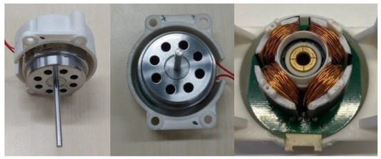 The existing microwave oven (MWO) cooling fan motor uses a 5W-rated shaded-pole induction motor (SPIM), as shown in Figure 1. The SPIM is characterized by a structure where the main concentrated winding is wound around the stator core, resulting in high losses in both copper and core, leading to low efficiency. However, due to its low cost, it is mainly used in low-power applications [1]. Although this type of induction motor has low efficiency and is unable to control variable speeds, it has the advantage of being simple to manufacture and having a stable structure. Accordingly, research has been conducted on design optimization for high performance and stable structure, as well as on cooling methods for high-loss induction motors [2] and on the accurate prediction of the stator winding temperature [3]. In the household appliance market, cost reduction has been prioritized over efficiency concerns, leading to the adoption of induction motors with low efficiency but competitive pricing. However, previously used SPIMs lacked speed control capabilities, requiring the use of different motors for fan applications that require different torque levels at different speeds. This resulted in an increase in fan motor management and operating costs. In this regard, research is needed to apply permanent magnet motors with high torque density, efficiency, and variable speed control to cooling fan motors. By replacing the existing SPIM with a permanent magnet motor, the use of variable speed control allows for the utilization of a single motor, thereby reducing management and operating costs. In addition, the higher output density in comparison to induction motors leads to a reduction in the use of magnets, windings, and cores.